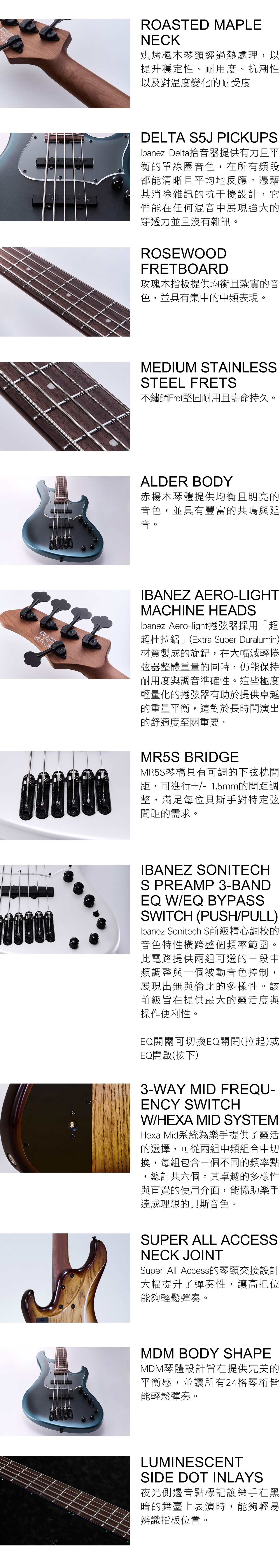 | 電路配置 | Ibanez Sonitech S Preamp 3-band EQ w/EQ bypass switch (push/pull), 3-way Mid frequency switch w/Hexa Mid system |
