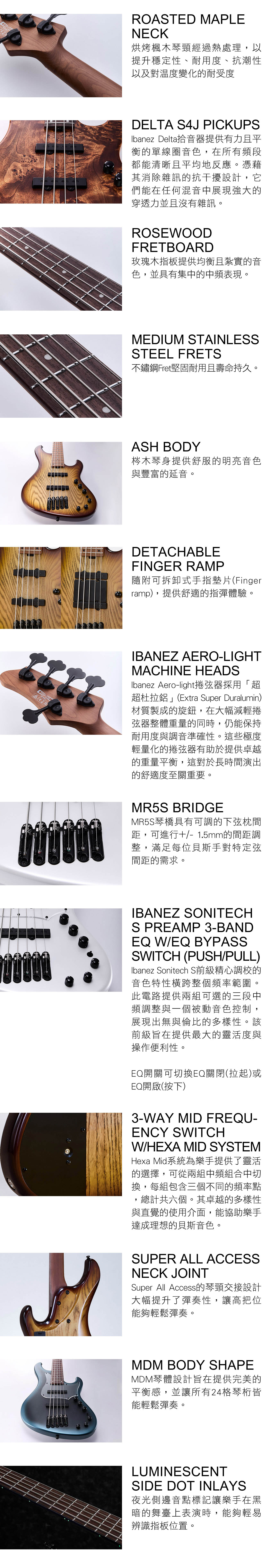 | 電路配置 | Ibanez Sonitech S Preamp 3-band EQ w/EQ bypass switch (push/pull), 3-way Mid frequency switch w/Hexa Mid system |