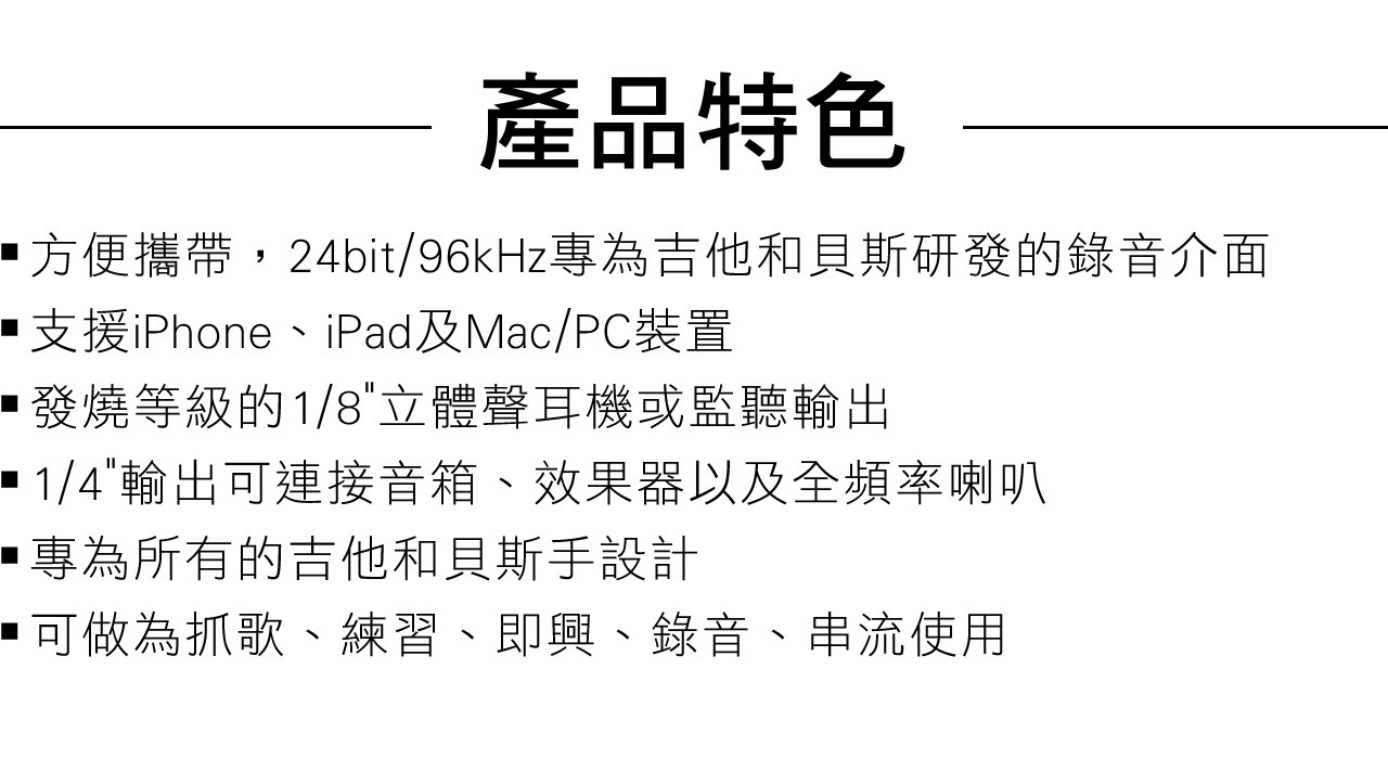 ● 方便攜帶,24bit/96kHz 專為吉他和Bass研發的錄音介面