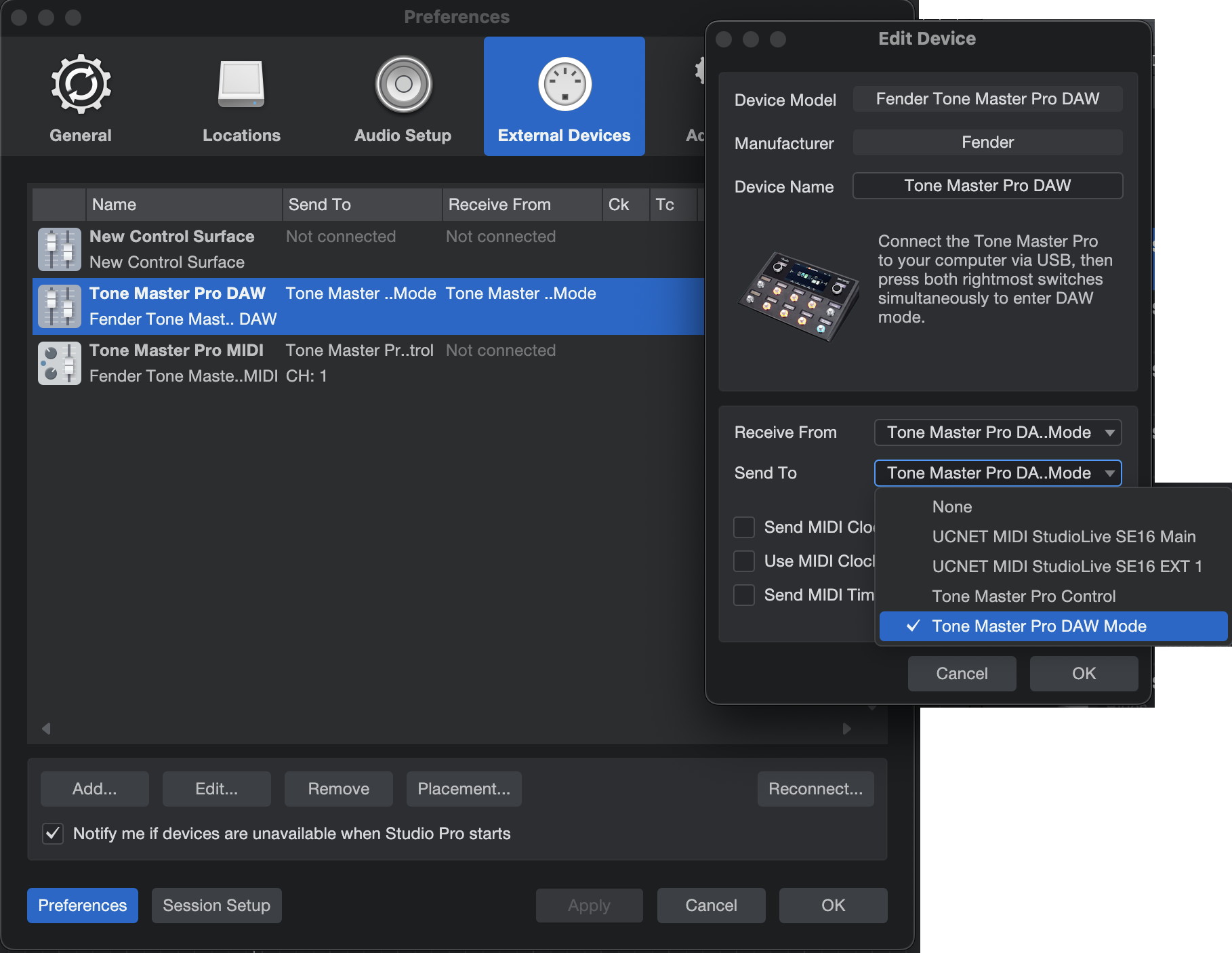 DAW Mode 隨著 Tone Master Pro 韌體 1.7.69 與 Fender Studio Pro 8 版本推出而提供,使用者只需更新至最新版本,即可啟用相關功能。