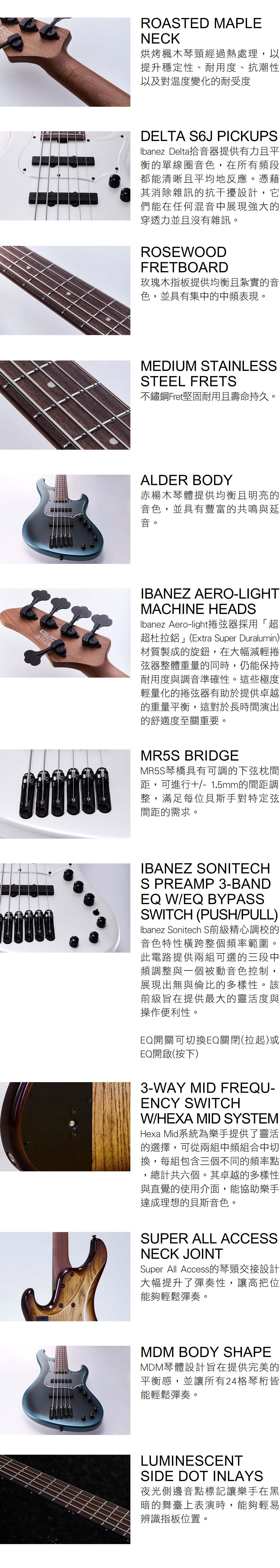 | 電路配置 | Ibanez Sonitech S Preamp 3-band EQ w/EQ bypass switch (push/pull), 3-way Mid frequency switch w/Hexa Mid system |