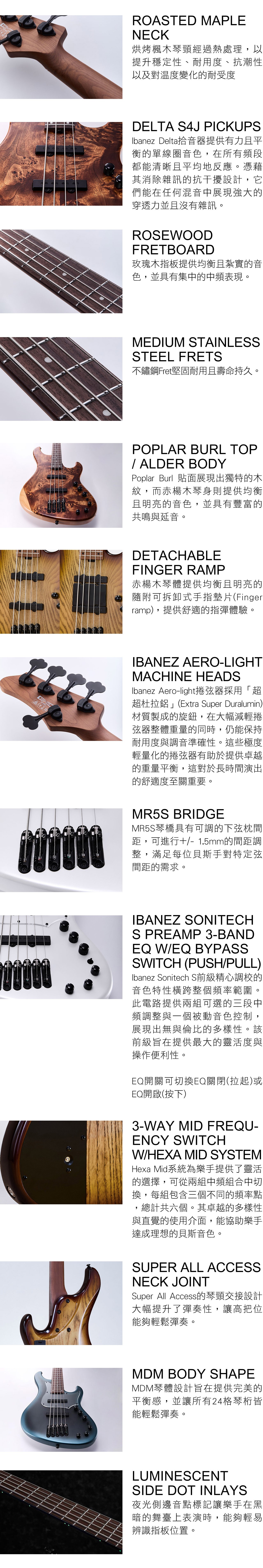 | 電路配置 | Ibanez Sonitech S Preamp 3-band EQ w/EQ bypass switch (push/pull), 3-way Mid frequency switch w/Hexa Mid system |